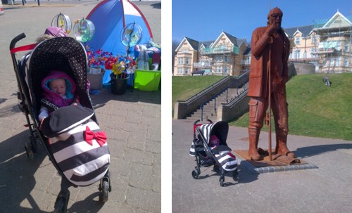 Wow we have been blessed with another beautiful day, so again I thought we would get out and about in the sunshine (just a shame there was more wind today.) This time we didn’t go onto the beach we just had a stroll across the promenade. I still think about how easy this stroller is to push; even with one hand. I think this is due to having them on the swivel rather than them being locked in the forward position. Along the promenade we stopped at daddy’s shop to see him, and we pinched one of his hats for Isabel. Just a shame it wasn’t red to go with the Go lightly.
