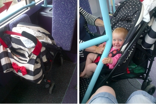 Isabel was intrigued at what I was doing with this colourful pushchair in our front room. Once it was ready to use, Isabel had a little test; I sat her in it and the first thing she did was touch the spots on the inside of the stroller. I think she liked it.