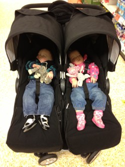 I had to grab a little bit of shopping the other day and instead of trying to find a double trolley, which is like finding a needle in a haystack, I decided to push the twins in their pushchair and carry the shopping I needed in my hand. In a normal pushchair this would end in disaster with an o.a.p stuck under the front wheels and the odd display disemboweled! This is not the case with the Britax B-Agile Double! I know I've said it before but I will say it again….this pushchair steers so well one handed and it is all because of the little Y shape in the middle of the handle, it enables you to have complete control. Now grannies we harmed on our shopping trip!