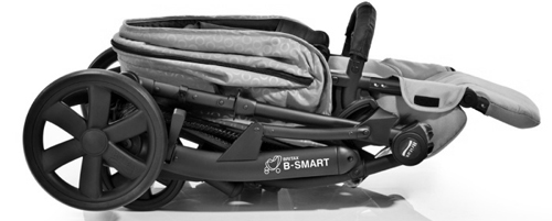 The B-Smart can be folded with the seat unit in place, as long as it is in the forward facing position and the seat is upright. With or without the seat in place, the frame stands vertically when folded compacting it's footprint to a tidy 34cms x 65cms with a maximum (with seat) height of 94cms.