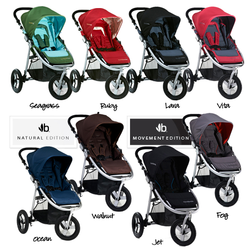 The Bumbleride Indie comes in Lara, Ruby, Seagrass and Vita (Aqua coming in 2012). Movement editions: Fog and Jet. Natural editions: Ocean and Walnut