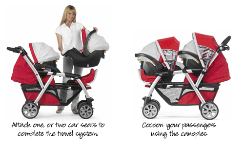 Two Chicco Key-Fit 0+ car seats can be attached to Chicco Together without the use of adapters. The pushchair canopies can be removed or left in place to form cocoon shields in conjunction with the car seat canopies.