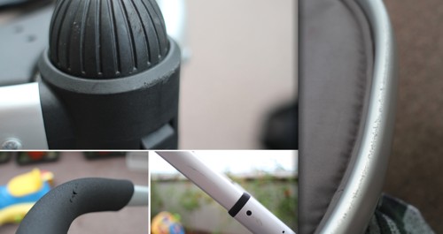September the 27th 2012In a couple more weeks I will of had the Peach Jogger for 6 months so I feel that now is a good time to asses it's condition. The jogger is a functioning piece of equipment and I treat it as such, although as it is not mine I probably am a bit more careful with it than I would be if it where my own. If you look at the pictures you will see that there is some damage to the handle - I did this whilst leaving my parents house, the front wheel slipped away and the handle (luckily) caught on to a small ledge, it damaged the handle but prevented the pushchair from tipping completely. The scratches across the metal on the underside of the seat unit have mainly been caused by taxi drivers taking the seat unit out of the boot and putting it straight down onto the pavement, rather than leaving it in the boot until the chassis is up and placing it directly in.