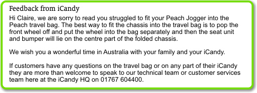 I was determined to take the Peach Jogger with us on our great adventure and so I bought the iCandy Peach travel bag however upon arrival I really struggled to pack the Jogger in to it, and could not manage to zip it closed. Unable to find a guide online I was forced to send it back and instead purchased a larger pushchair travel bag, this bag was far from ideal but with a bit of help from the girls I was able to get it closed. At Heathrow I was able to take the buggy right up to the boarding gate and pack it in to the bag there. I also managed to fit in Fayes Rain Cover, Cosy Toes and Blanket. If I had a parasol then I'm pretty sure I could of squeezed that in too. The extra space was definitely handy as we simply would not of been able to fit anything else in to our hold luggage, however I preferred the look of the iCandy bag and the fact that it had wheels.