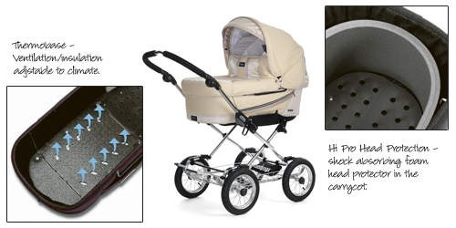 The carrycot has a Thermobase which allows it to be ventilated or insulated depending on the climate. Built in to the base, a back rest to helps your child to sit up slightly when it's old enough. The shock absorbing head protection ensures your inevitable ‘learner driver' knocks and bumps won't hurt your passenger in any way.