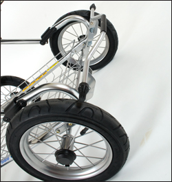 The adjustable suspension EAST (Emmaljunga Adjustable Suspension) allows you to adjust the strength of the suspension to your terrain or to accommodate your child's weight increase. It can be set to Soft, Medium or Hard via the knobs on the side of the chassis. The four, 28cm, air filled tyres add more cushioning and can be easily removed to make the fold slightly smaller.