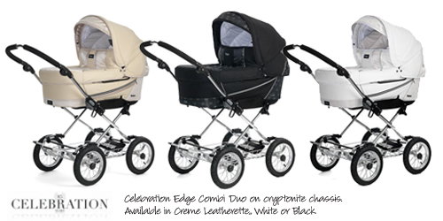 Our sample model is a special edition brought out to mark Emmaljunga's 85th anniversary. It is in a creme leatherette fabric with silver piping, it is also available in white or black