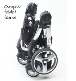 The Peach frame is quite heavy at 10kgs but can be easily reduced to 8.4kgs by removing the wheels, however it will stand vertically making it easier to stow in the car or store at home.
