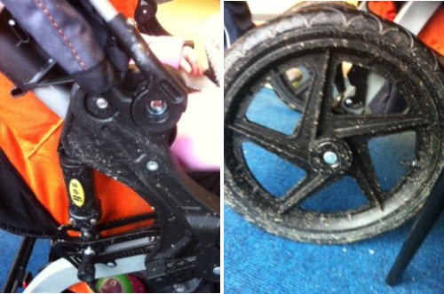 I noticed today that the tyres need pumping up. It's the first time since I got the pushchair, so I don't think that's too bad, especially as we use the pushchair "off road" so much. A tyre pump is an extra that has to be purchased on top of the price of the pushchair, but luckily we already have one. It's not portable though so let's hope I don't get a puncture while I'm out and about!!