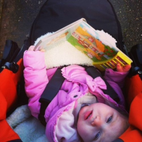 Reading in comfort on a walk to the shops!