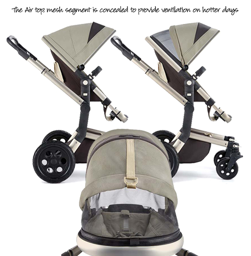 Another feature unique to the Expedition is hidden within the large, aluminium framed canopy. The last segment of the hood peels back to reveal a mesh segment which provides fantastic air flow over your child on hotter days, with the added advantage that the rest of the canopy still shades them.
