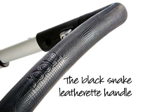 The chunky matt aluminium chassis extends up towards the handle with all the folding mechanism concealed in a well moulded, well finished, black plastic. The handle is covered in black snakeskin affording a comfortable, sturdy grip and a stylish signature. Once again, this is not only about the looks, the handle extends telescopically out of the frame from 100 to 110cms catering for all heights.