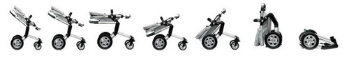 To make a more compact finished fold, remove the seat. It can then be laid horizontally and with the bumper bar released, the wheels removed (by pushing the button in the centre of the wheel) and the seat unit stacked on the chassis with all the bits stored in the hollow of the seat. This is the perfect fold for a smaller boot.