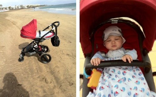The difficulties appeared when I tried to go through the sand. I stuck. I actually turned the pushchair and pulled it behind me on two back air tyres. It was ok this way, otherwise the two small front wheels, even though they have their own beautiful suspension, are a bit too small to go through the sand. All in all, as long as you don't try to get through the sandy beach, you will have a nice stroll on every road or off-road.