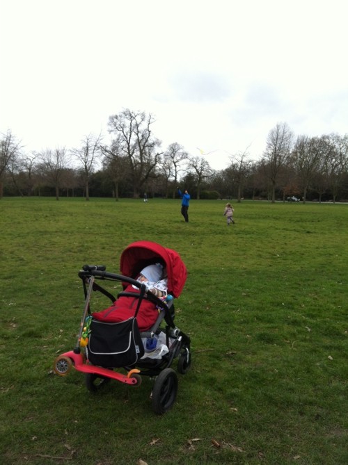 We didn't moan about the windy weather but used it to fly our kites. We pushed Affinity through the grass, loaded with the scooter (it is actually quite nice to hang a scooter in the middle of the handlebar, it doesn't slide down this way). Again I appreciated how easy it is to change the direction of the seat, I swapped it twice during this walk to protect the baby from the wind.