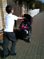 He has now discovered if he pushes his baby Sister in the pushchair, he can put his book bag and lunch bag in the basket underneath.