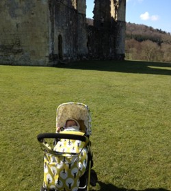 Today the sunshine came out - it was still very cold but a little sunshine is all we need to head out - and what better than an Easter egg hunt at a big old castle! Around the castle are grassy hills - soggy grassy hills, now whilst the Giggle copes very well with soggy grass, doesnt sink too quick, doesnt spray mud behind on mummy, it doesnt however like soggy grass being travelled at an angle on a hill, in this case four wheels would be better than three! However we kept a firm hand and all was fine, and this wouldnt be a downside for the Giggle alone but I defy any 3 wheeler to manage it ;) Not long till Easter egg time.