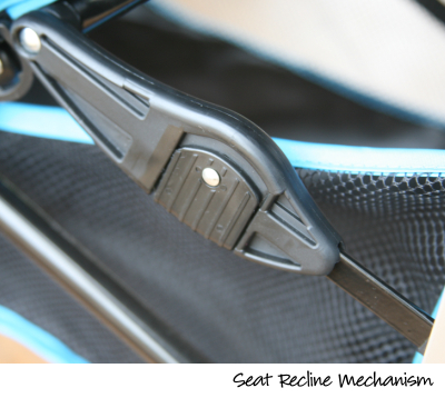 The recline is brilliant! Under the seat are two sliding mechanisms, one on either side. On the underside of these are buttons. To recline, pull in the buttons (best done from behind the stroller) and the weight in the seat will help it to fall back into the reclined position. There are 4 positions to choose from, from upright to almost flat. If you don’t want the seat to drop back to flat and just want to ease it back, press each button alternately and the seat will move one position at a time! Brilliant.